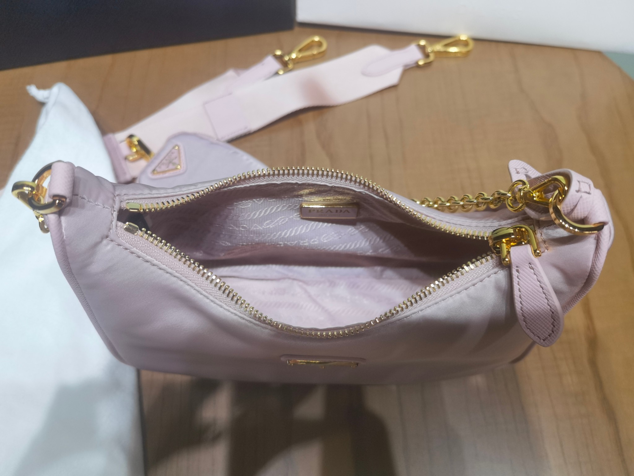 This is a replica Prada Re-Edition 1BH204 2005 Re-Nylon bag. ,Saffiano trim,Removable chain handle,Detachable adjustable 85 cm logo-print woven nylon shoulder strap,Removable Re-Nylon zipper pouch with Re-Edition keychain,Metal hardware,Enameled metal triangle logo on the front,Zipper closure,Re-Nylon logo lining,Height: 18cm,Width: 22cm,Length: 6cm