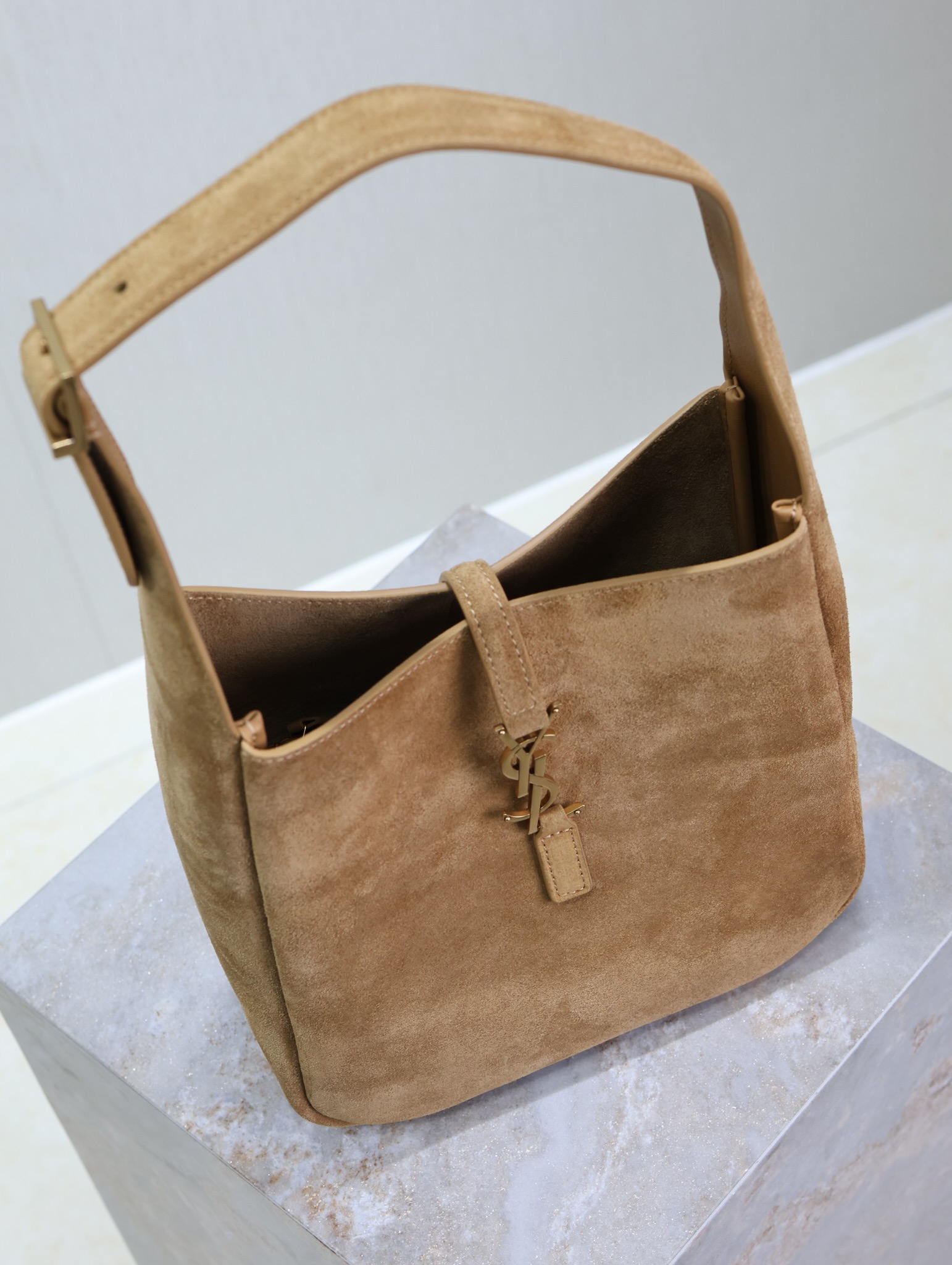 This is an replica SAINT LAURENT small version of the iconic 5 À 7 in suede leather.,