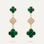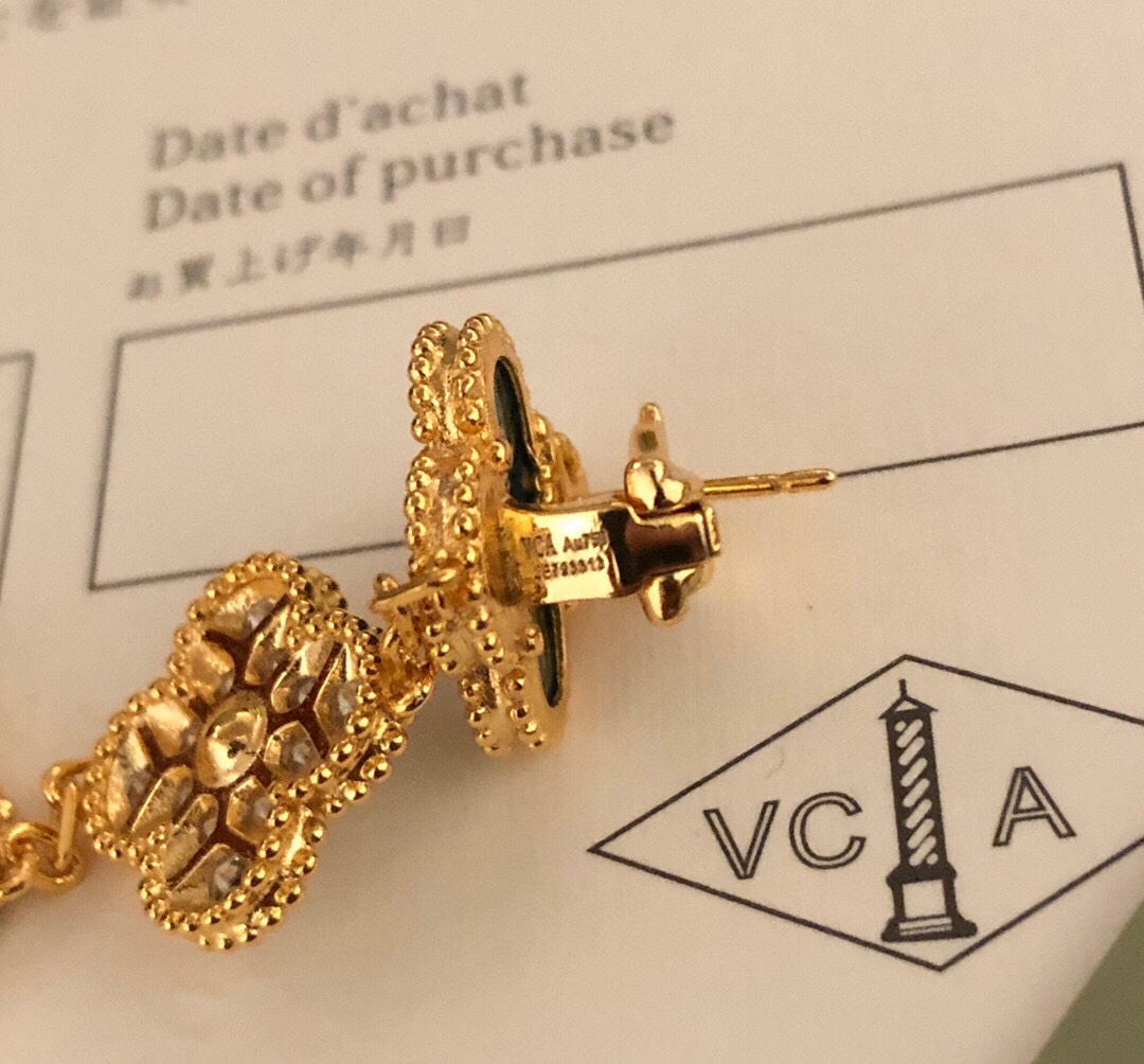 This is a replica of Van Cleef & Arpels Magic Alhambra earrings, 3 motifs, malachite. All earrings are crafted with the exact same design as the original. Product Description:18K yellow gold plated on vermeil, garnished with moissanite stones.