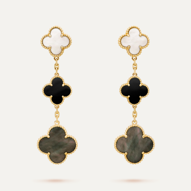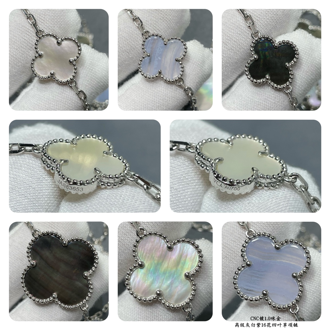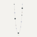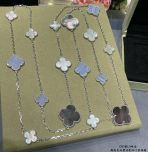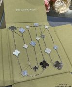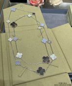 This is a replica of Van Cleef & Arpels Magic Alhambra long necklace, 16 motifs. All necklaces are crafted with the exact same design as the original. Product Description:18K white gold plated on vermeil, Chalcedony, Mother of pearl.