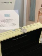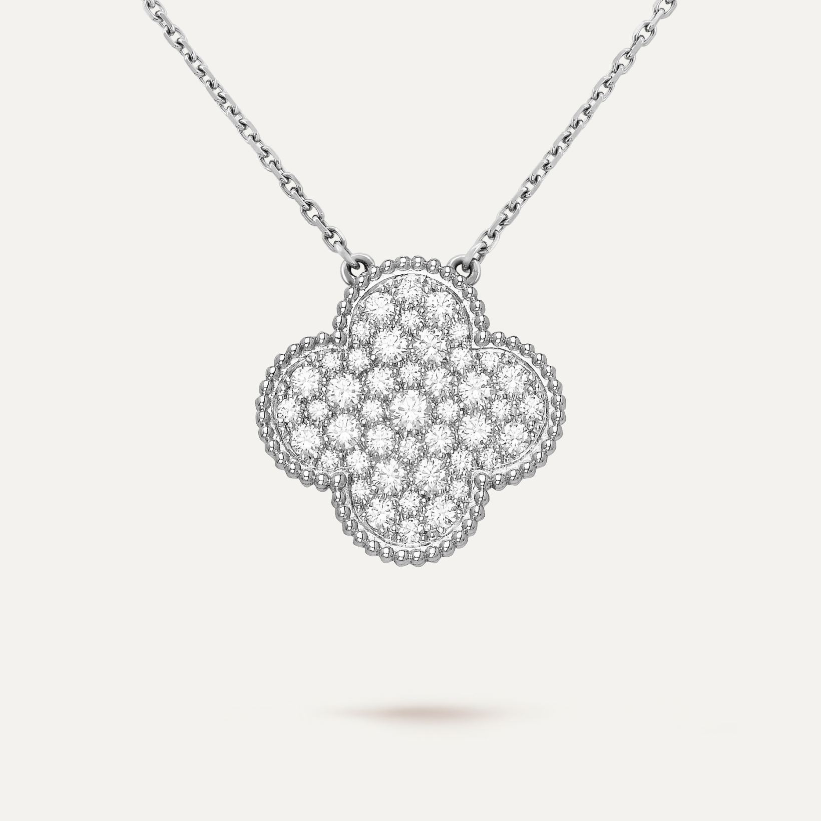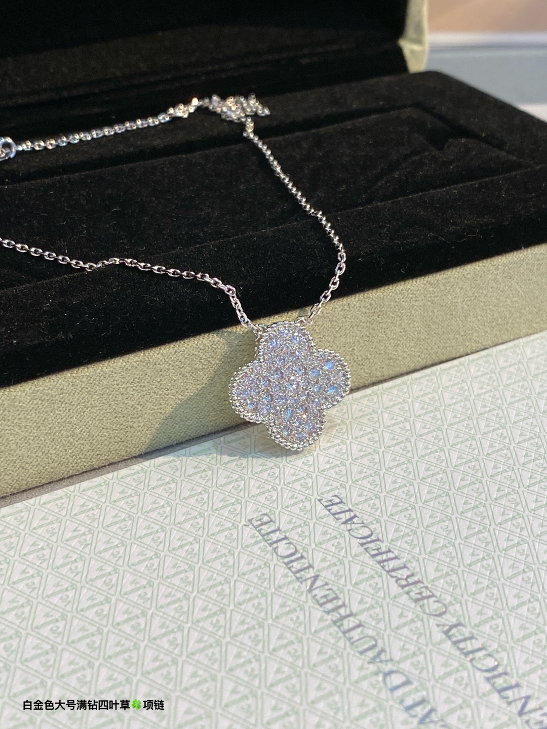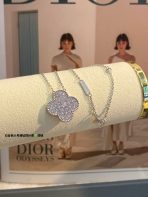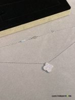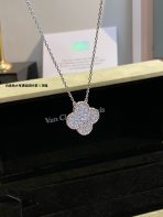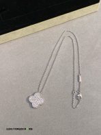 This is a replica of Van Cleef & Arpels Magic Alhambra pendant. All necklaces are crafted with the exact same design as the original. Product Description:18K white gold plated on vermeil, garnished with moissanite stones.