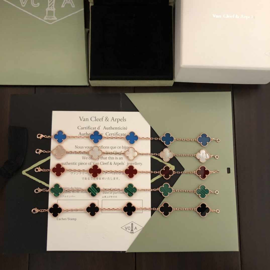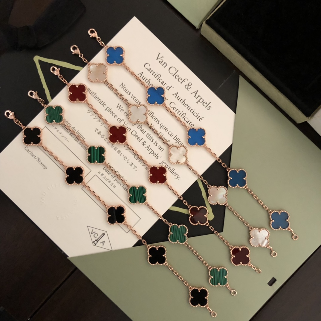 This is a replica of Van Cleef & Arpels Vintage Alhambra bracelet, 5 motifs. Coming in different stones – Carnelian, Tiger Eye, Malachite, Agate, Diamond and Onyx. all bracelets are crafted with the exact same design as the original. Product Description:Mother-of-pearl: 5 stonesHallmar