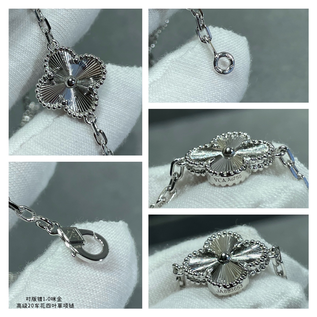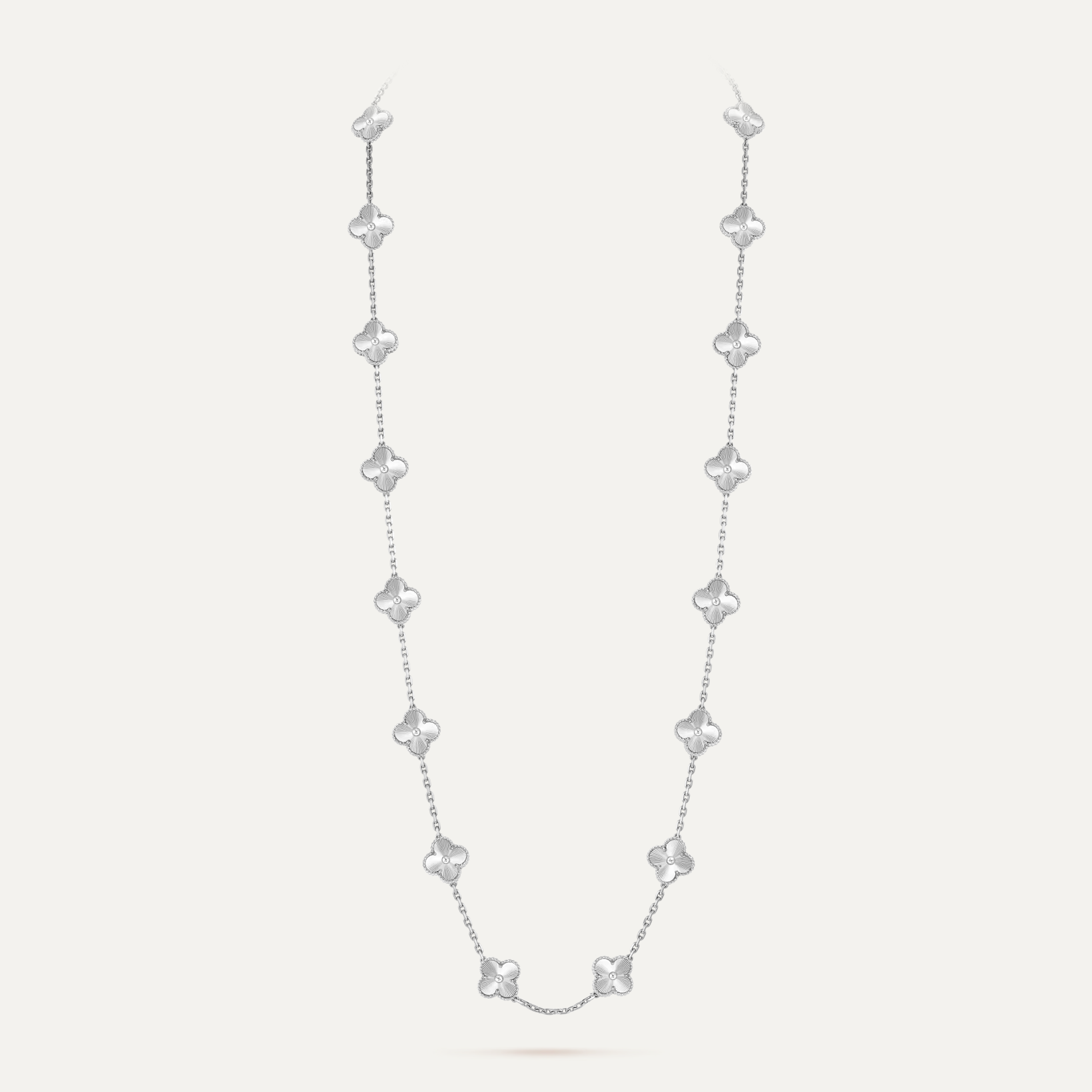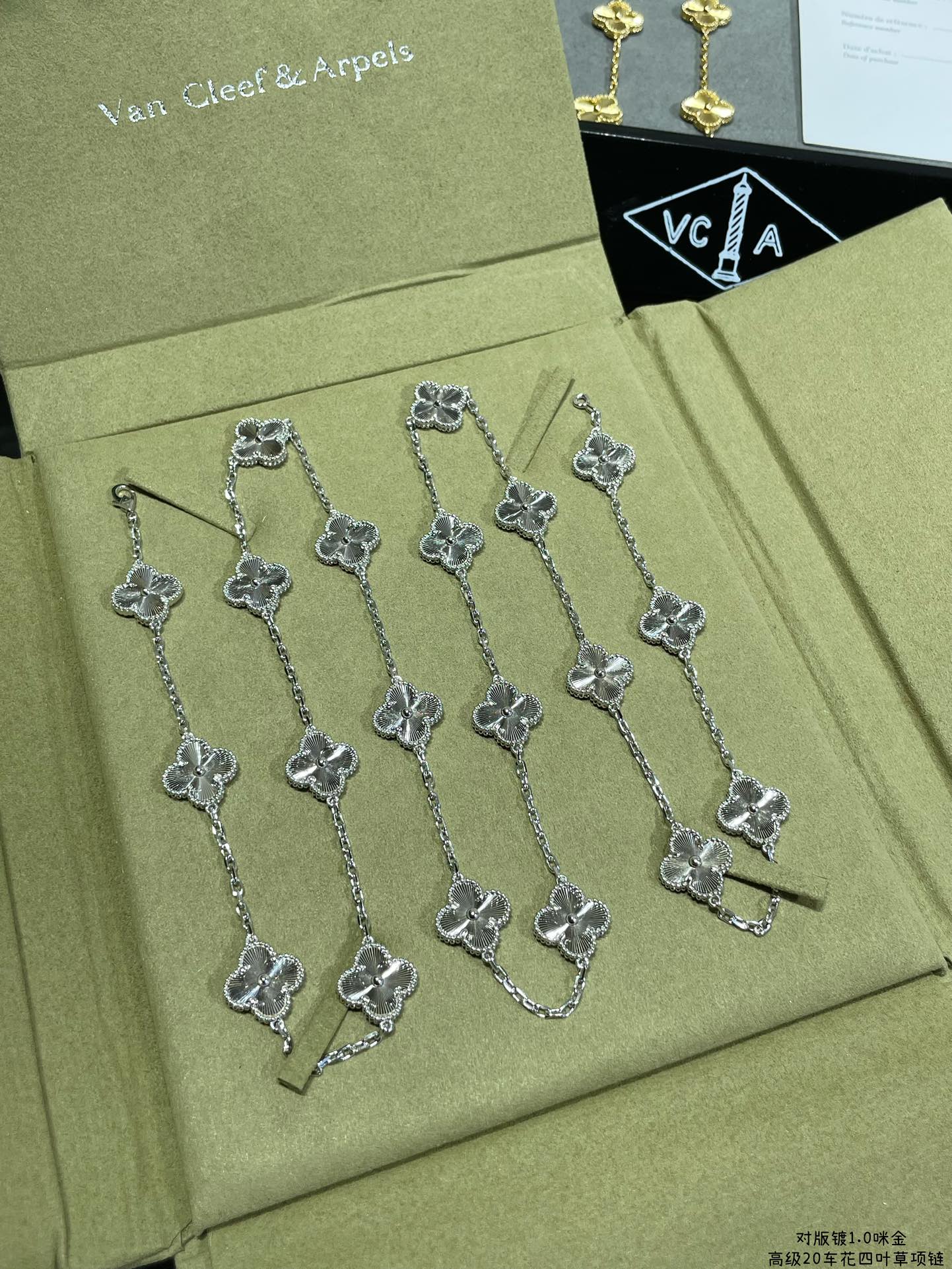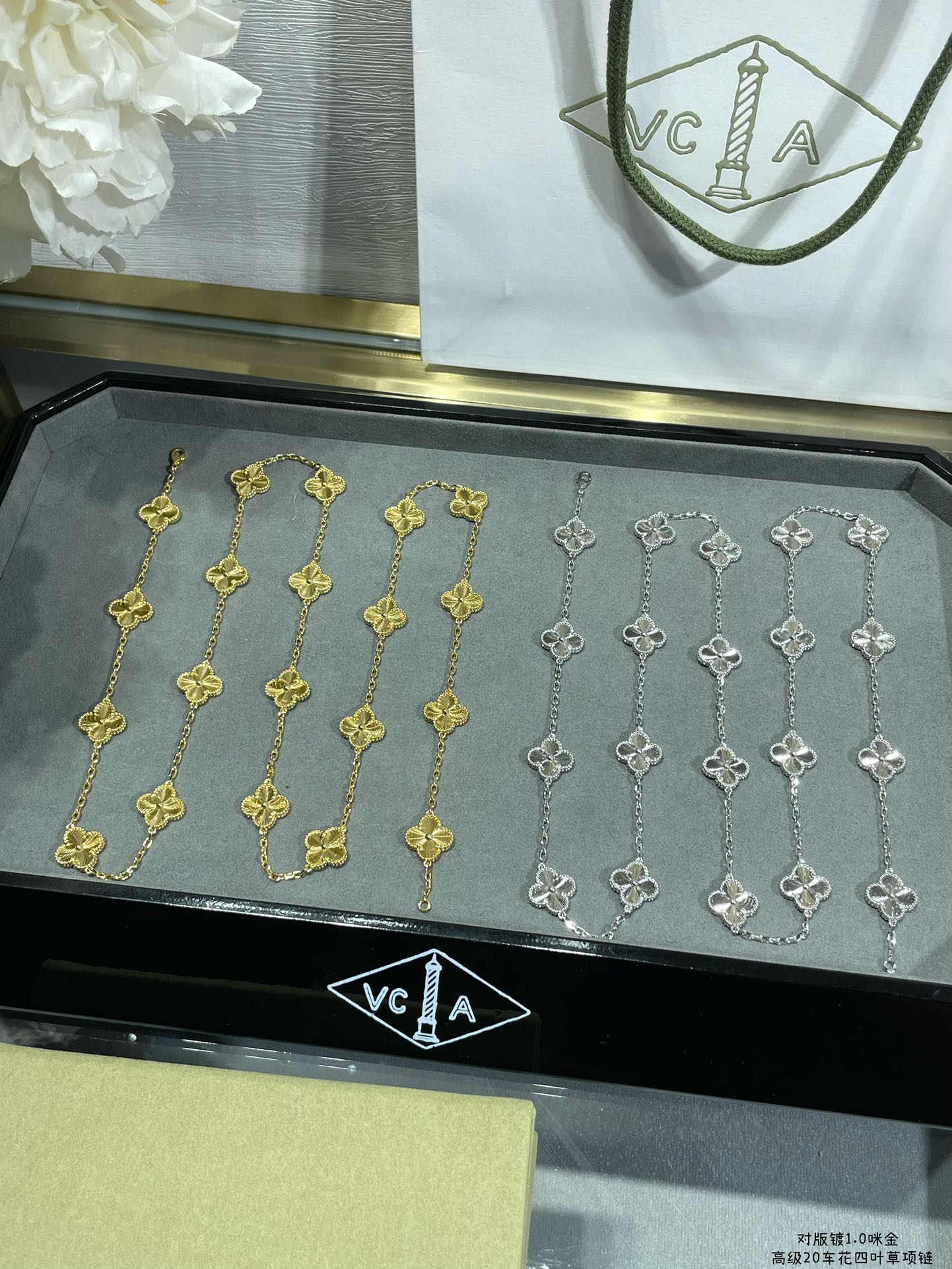 This is a replica of Van Cleef & Arpels Vintage Alhambra long necklace, 20 motifs. All necklaces are crafted with the exact same design as the original. Product Description:18K yellow/white gold plated on vermeil.
