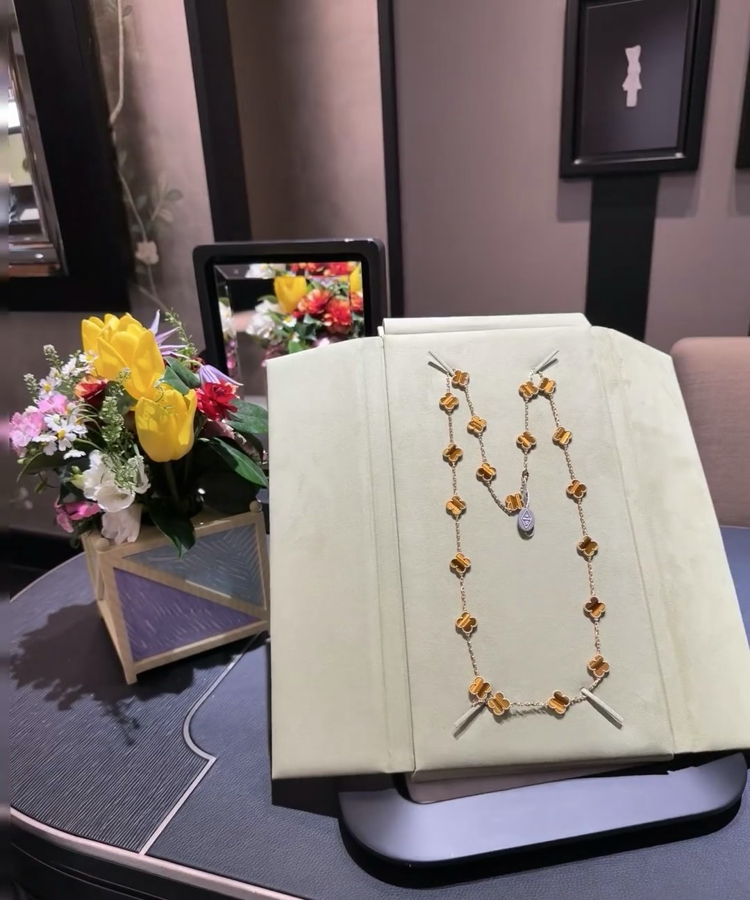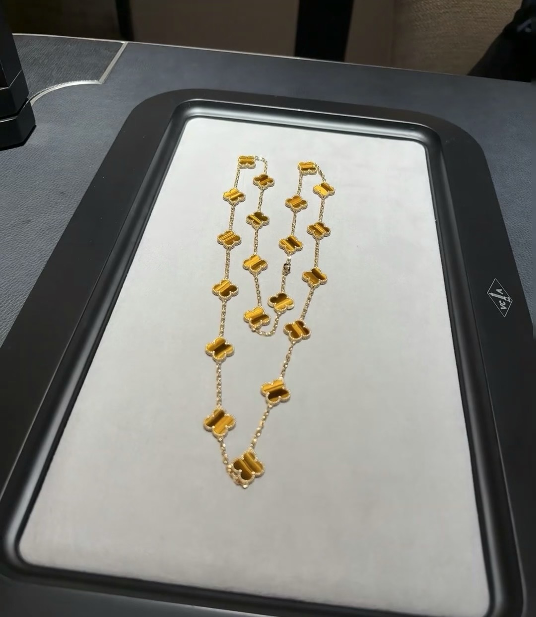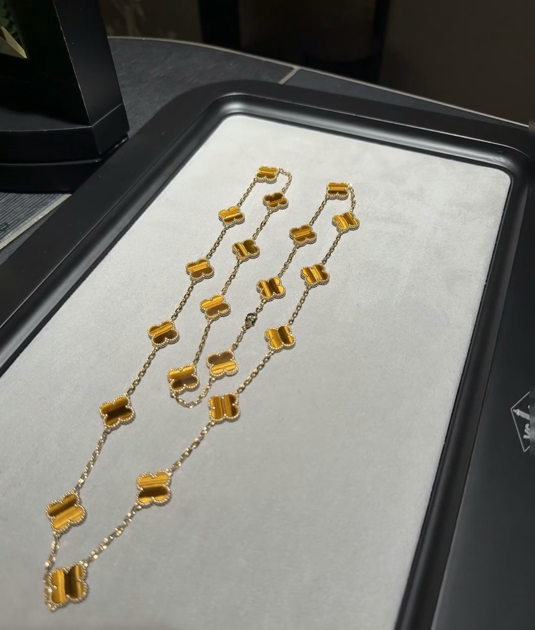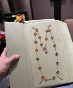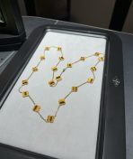 This is a replica of Van Cleef & Arpels Vintage Alhambra long necklace, 20 motifs. All necklaces are crafted with the exact same design as the original. Product Description:18K yellow gold plated on vermeil, tiger eye.